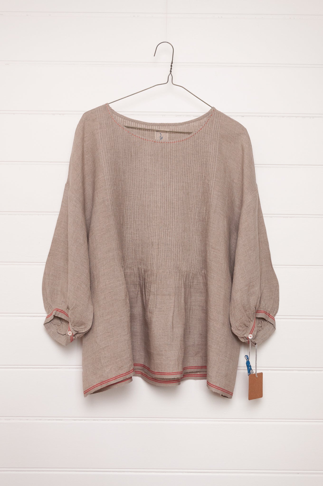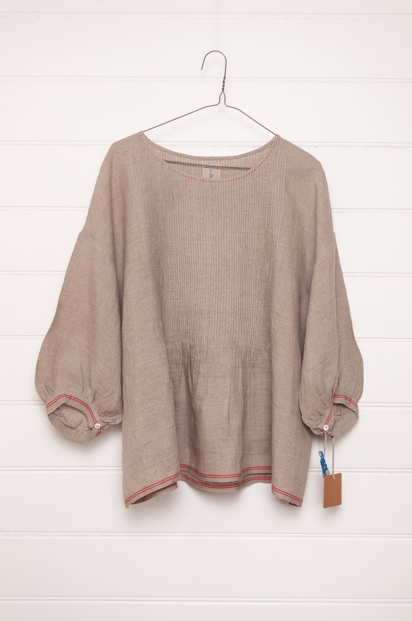 The Anisha top in natural linen features artisan stitched pin tucking front and back, three-quarter drop shoulder sleeves gathered and finished with a shell button, selvedge edging in crimson red and hand stitched details. This one size top is perfect all year round.
