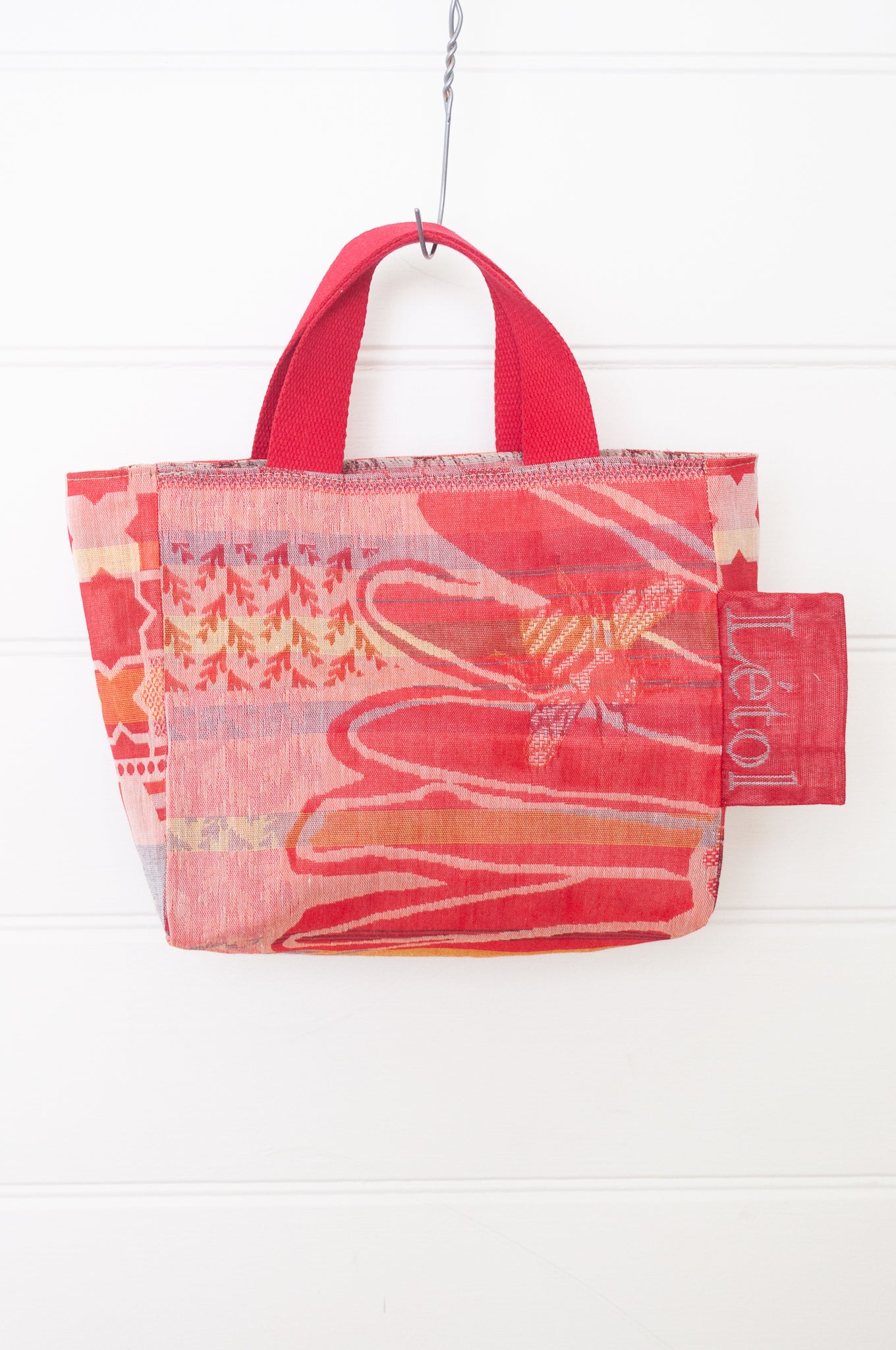 This mini Létol bag features an abstract floral print on one side in shades of crimson red and orange, adorned with a beautiful bee, with a co-ordinating print in pink and red on the reverse.