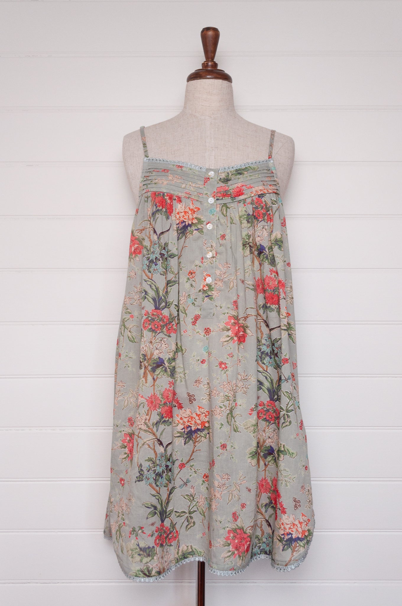 This Juniper Hearth nightie is screen printed with delicate blooms in rose pink, vanilla and turquoise on a soft duck egg blue background.