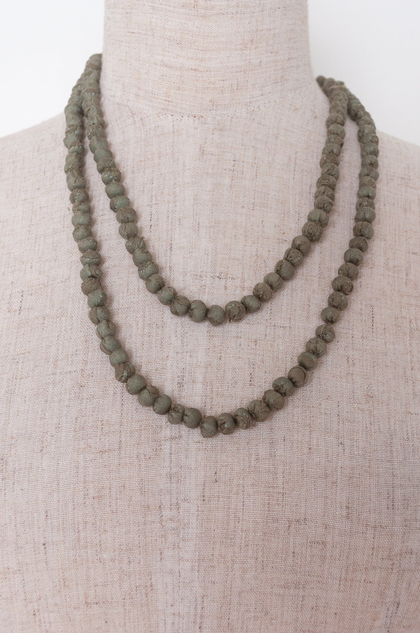 This beautiful necklace is made from fabric remnants, each small bead formed by hand, filled with smaller pieces of fabric and thread.