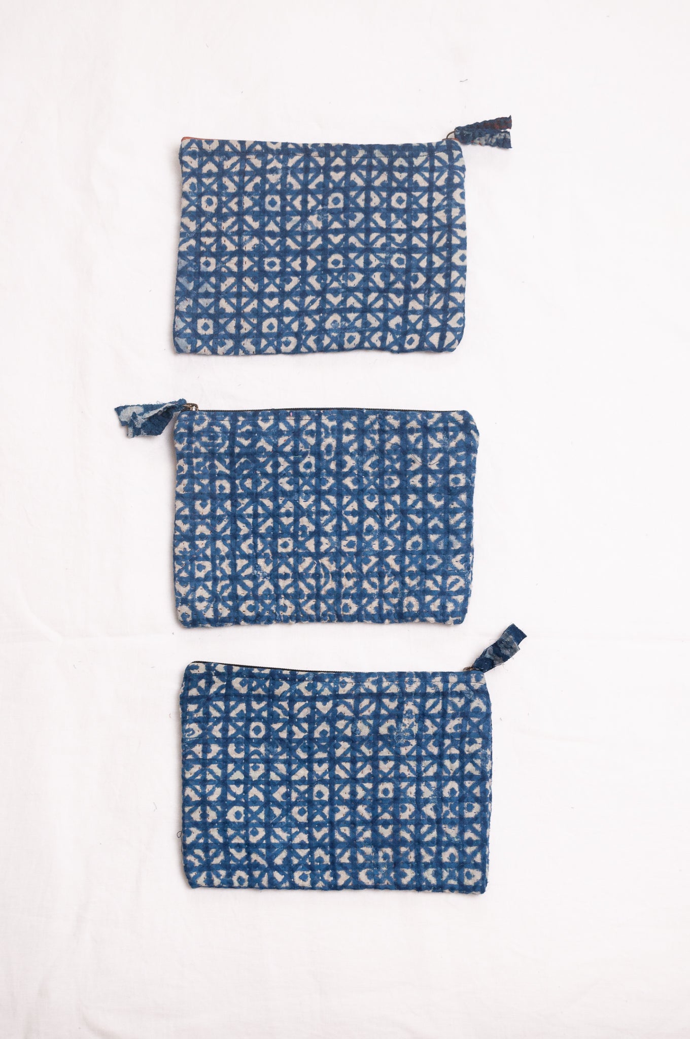 Made from kantha quilts (lovingly stitched layers of vintage cotton saris recycled as bedcovers), each of our gorgeous pouches is one of a kind. These pouches were made from a quilt that has been blockprinted and overdyed.
